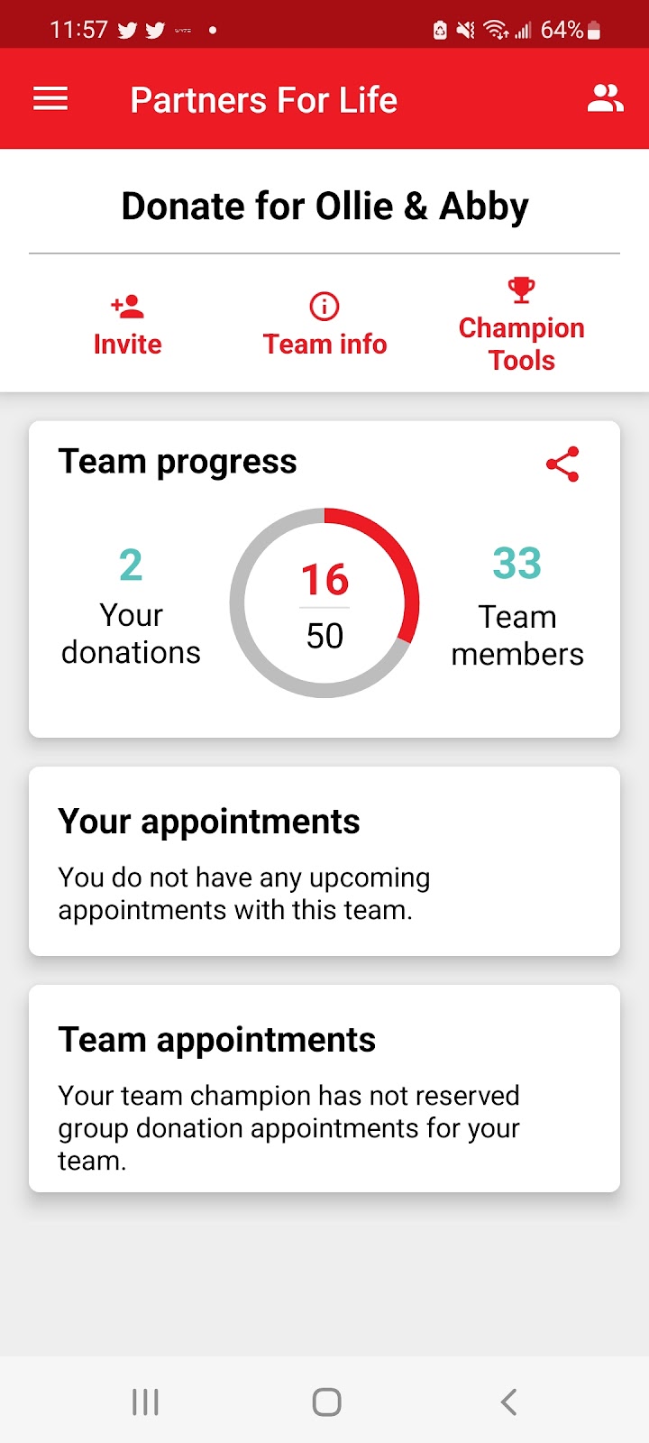 [Photo Description: A screen capture of Dawn's GiveBlood App showing that so far 16 donations have been made by members of the "Donate for Ollie & Abby" team.]
